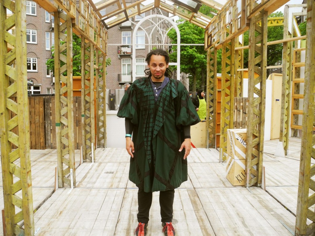 Een verwonderend decor tref ik aan. Verwonderend omdat deze plek, het Steve Bikoplein, er normaliter wat verlaten bij ligt. Nu en dan opgemerkt door een scherpe voorbijganger: “Hee, best een grappig pleintje.” En net zo snel weer vergeten. Maar nu niet. Nu is dit het toneel – letterlijk – van Shakespeares pareltje Romeo en Julia, uitgevoerd door het community arts project HEIM. Strenge regisseurs zetten met de acteurs de laatste puntjes op de i. Juan-Carlos vertolkt de rol van broeder Lawrence, die van het slaapdrankje ja.