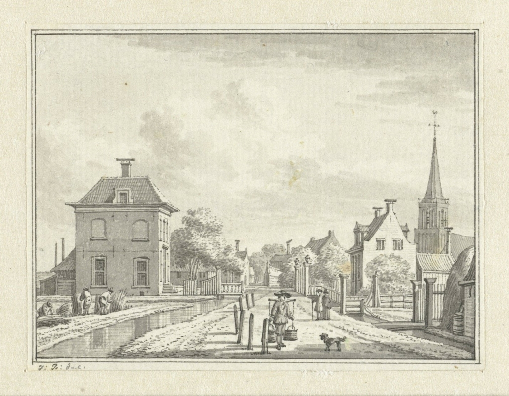 Afbeelding: Gravure van Oud-Diemen gezien naar het noorden, rechts de Mariakerk (collectie Historische Kring Diemen).