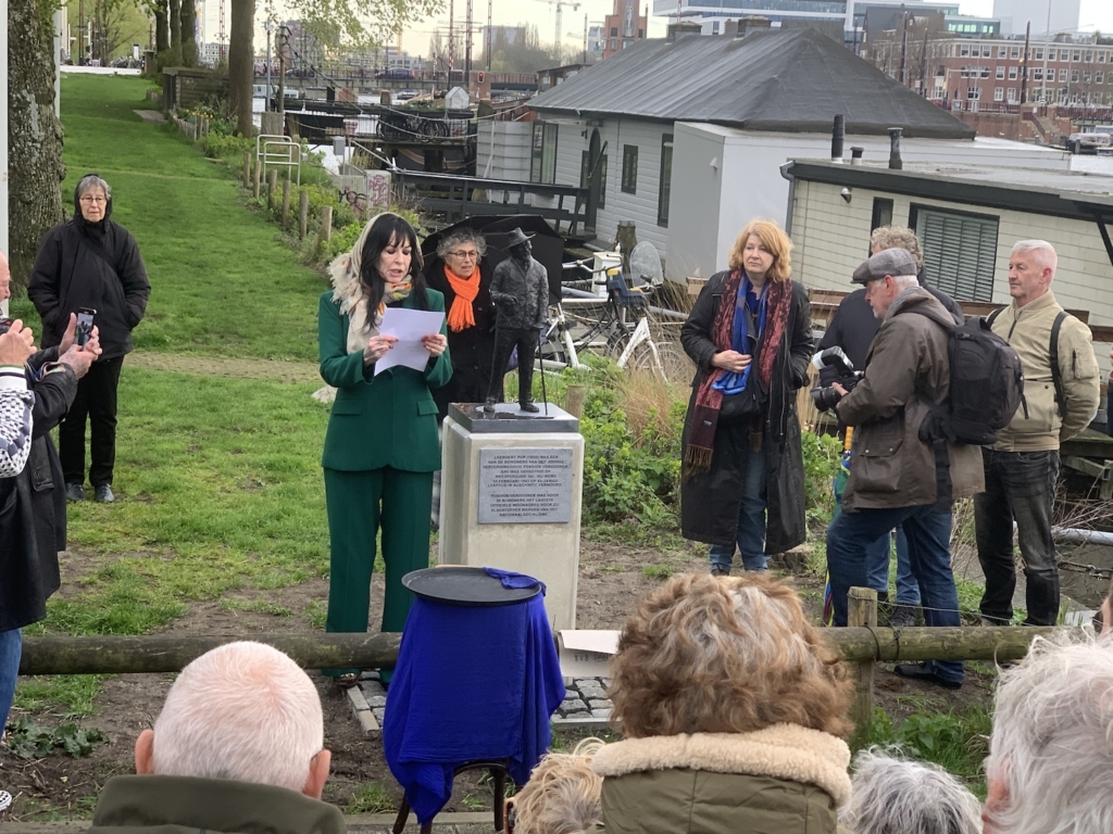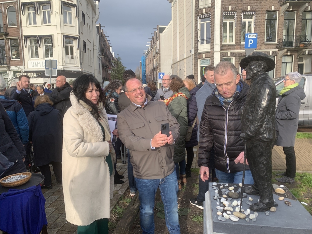 Begin deze maand stond hij er al, sinds donderdag 28 maart is de terugkeer van Leendert Pop (1859-1943) naar de Weesperzijde officieel. Stadsdeelbestuurder Jan-Bert Vroege en rabbijn Rookmaaker onthulden het beeld aan de Amstel. Nabestaanden van Leendert Pop en Mustapha Slaby, woordvoerder van de nabijgelegen Al-Kabir moskee, waren hierbij aanwezig.