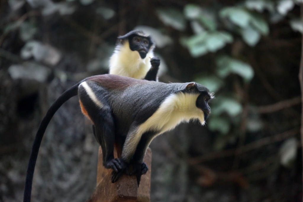 Nieuw kroost in de Plantagebuurt. Eind vorige week verwelkomden de dianameerkatten een jong. Het gaat goed met moeder en kind, die komende weken onafscheidelijk zijn. De tante van het jong, mogelijk een aanstaande moeder, komt regelmatig op kraamvisite. De pasgeborene groeit flink en is al goed te zien voor bezoekers.