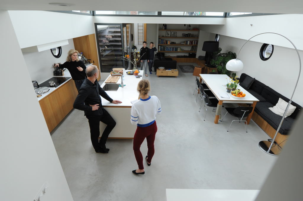 Vóór in het schip ten slotte, af te sluiten met schuivende panelen, is het leefgedeelte van de kinderen gecreëerd: drie slaapkamers, een grote gezamenlijke ruimte en boven op de badkamer een slaapplek voor vrienden en vriendinnen. Als het kraaiennest van een groot zeilschip, te bereiken via een ladder. Na tweeënhalf jaar op deze plek weet de familie: “Je leeft vrijer leeft op een schip. Je gaat de loopplank over en dan is het alsof je iets achterlaat op de wal.”