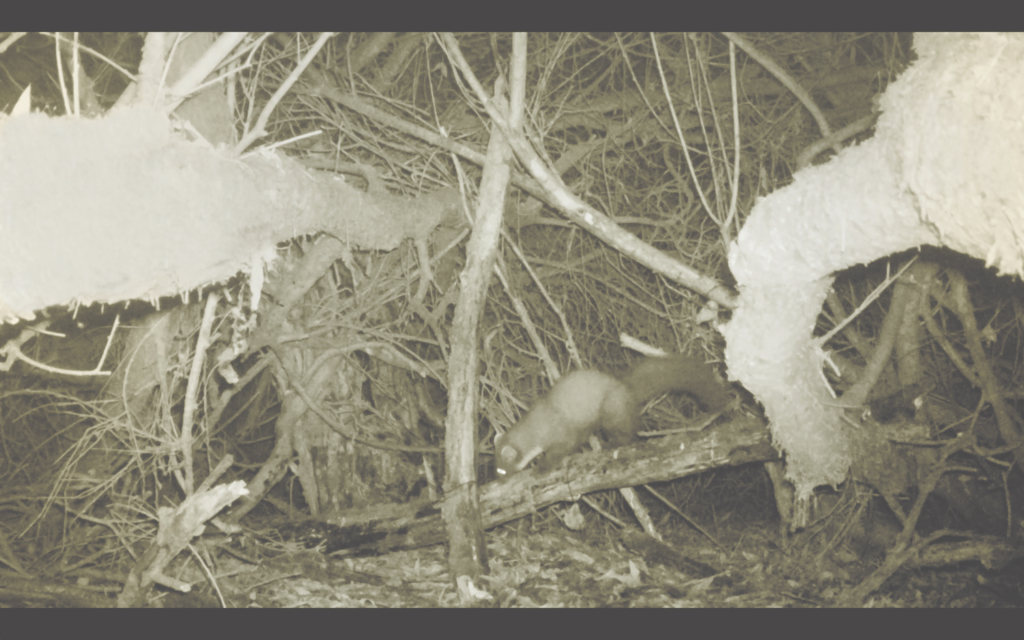 Maar toen doemde er onverwacht – ‘behalve heel veel eksters de hele tijd’ – een ander dier voor de camera op. Voet toont op haar laptop beelden van de boommarter. “Hij gaat zo iets heel leuks doen. Kijk, zag je dat? Hij markeert z’n terreintje. Ongelooflijk.”