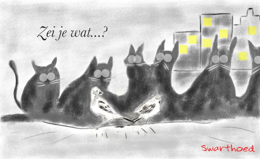 Plotseling viel het me op, ik zie nooit meer vogels in mijn straat. Trok er vroeger nog wel eens een koppeltje koolmezen van boomtop naar boomtop, zag ik soms in de winter nog wel een roodborstje scharrelen in de struiken, de laatste tijd is alles stil, doodstil. Hoe komt dat, vroeg ik me geschrokken af.