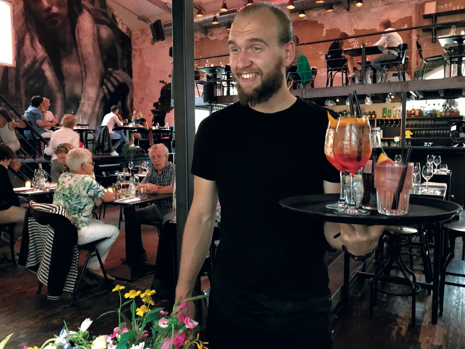 Het Paradijsplein? Hier moeten we zijn! Het is inderdaad een toffe plek, verrassend. De kleuren, ton sur ton, en een fijne hipsterober. We bestellen een cola voor de schrijfster want die onthoudt het anders niet. Het panel: “Dit zijn de mooiste tot nu toe.” En: “Het is net grapefruitsap, je proeft geen alcohol.” Maakt de drank nu overmoedig? “Deze is bitter, dit is echt mijn drankje.” De man onder ons raakt op dreef. “Zalig.”