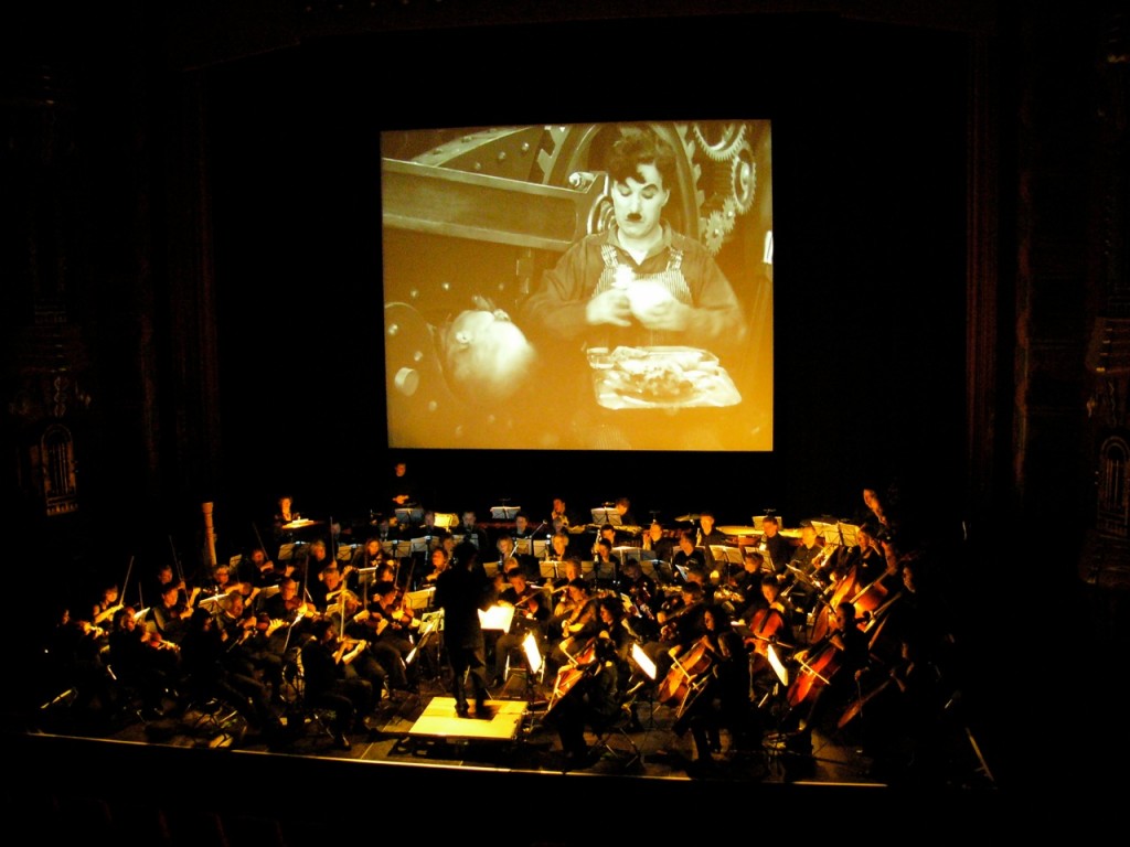 We spelen veel bijzondere werken op mooie plekken in Amsterdam, zoals op de foto te zien is.. Tuschinski begeleiding van een Chaplin film.
