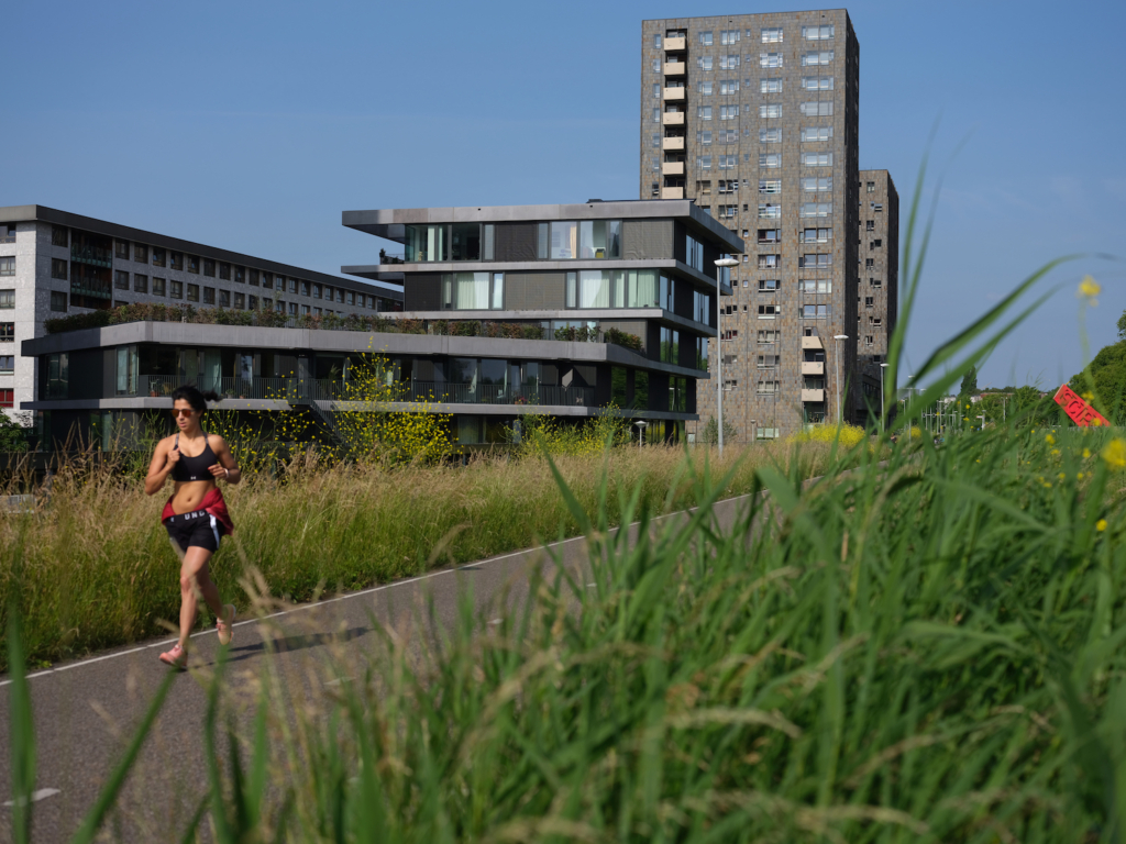 Twintig jaar geleden had een architect dit niet kunnen bedenken, maar sindsdien is het mainstream geworden om houten latten in een open constructie, dat wil zeggen met een ruime spleet ertussen, voor een zwarte folie langs te monteren. De folie doet het werk, de latten zijn er voor de sier. Ik lees op de website van Atelier van Wengerden over het ontwerp. CPO met zestien woningen. Bekroond met de Zuiderkerkprijs 2019. Nog meer mooie projecten op de site. Leeftijdgenoot. Doorwrochte, doorwerkte projecten. Elaborate. De achterkant van het pagodegebouw is zelfs een beetje té elaborate.