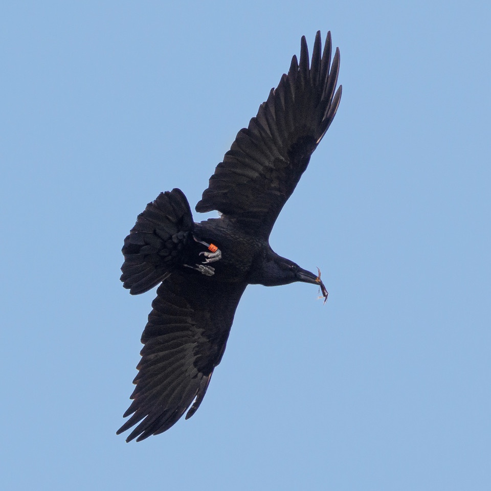 Het mannetje van dit koppel is in Hilversum geboren, blijkt uit de ring om zijn poot. In het gebied bij de energiecentrale van Diemen broedt ook een zeearend. Ewout denkt niet dat de vogels elkaar in de weg zitten. “De raaf wil de zeearend weleens treiteren door om hem heen te gaan vliegen en hard te roepen. Maar de zeearend trekt zich daar weinig van aan.” De raaf is een grote vogel, bijna zo groot als een buizerd.