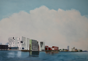 Ik loop door het station heen en neem de veerpont naar Noord. De massa trekt stroperig met mij mee. Aan boord loop ik door naar het voordek met een goed zicht op de overzijde. Vroeger begon daar de rest van Nederland, maar nu zie ik het nieuwe Amsterdam. De voormalige Shelltoren staat er fier naast Eye. Ze hebben niets van doen met de oude silhouetten van de grachtenpanden, maar vormen onmiskenbaar de nieuwe horizon van de stad.