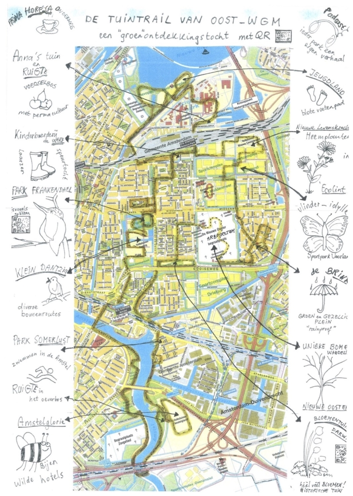 De route loopt ruwweg van station Amstel tot Science Park en doet zo’n twaalf groene plekken aan. Het idee is om horeca onderweg aan te laten sluiten. Volgens Veerman hoef je niet de hele wandeling in een keer te lopen, je kunt er ook voor kiezen één onderdeel te doen. “Bijvoorbeeld met je kinderen het blotevoetenpad in Jeugdland, met afsluitend een leuke knutselactiviteit. Of je gaat voor de unieke bomenwandeling in De Nieuwe Ooster met een kopje afhaalkoffie toe.” Ze geeft aan dat de wandeling in principe voor iedereen geschikt is en dat er wordt samengewerkt met welzijnsorganisaties. “Vanuit de zorg wordt wandelen gestimuleerd omdat het gezond is, ziektes zoals depressies kan verminderen en eenzaamheid tegengaat. Wandelen is in die zin een goed medicijn. En wie weet kan de TuinTrail zelfs de meest fanatieke wandelaar nog verrassen. Er valt in elk geval nog veel over ons mooie stadsdeel te ontdekken, en het is weer eens wat anders dan een rondje Flevopark.”
