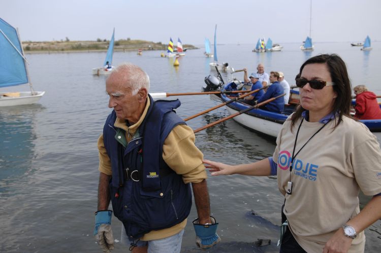 Caroline Korsten, de spil van Rondje IJburg, hier in 2009 op de foto met de kapitein van zeesloep Piet Haverkamp, die met zijn team de groepsprijs in de wacht sleepte.