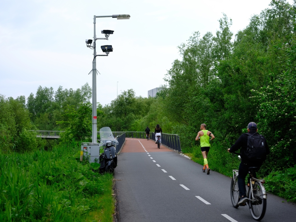 De afgelopen jaren is het misverstand ontstaan dat camera’s en sensoren meer zien dan mensen, of in elk geval een belangrijk verlengstuk zijn van onze zintuigen. Ze groeien inmiddels sneller dan het voorjaar. Trossen apparatuur aan stalen palen houden de stedelingen permanent in de gaten, hun bedoelingen verborgen in camouflage-grijze behuizingen en achter beleidsnotities die niemand las. Ze zijn er gewoon ineens, in soms wonderlijke samenstellingen, zoals hier op de brug: elke keer dat je aanzet om de steilte te nemen kijken ze recht in je gezicht, als een waarschuwing, de premisse dat je iets verkeerd doet. Maar wat?