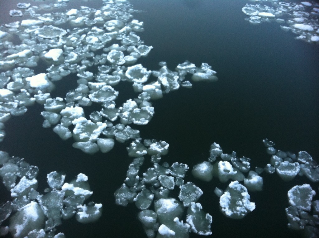 IJsschotsen bij de brug voor Vrijburcht, samengedreven door de wind.