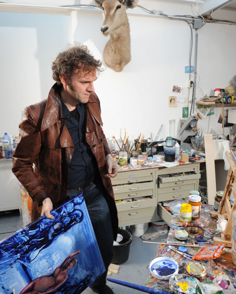 “Ik vind het heel leuk als mijn vrouw langskomt in mijn atelier, zodat ik kan laten zien wat ik maak. Soms werk ik wel een maand aan een doek. Zij denkt anders ook: ja die jongen gaat wel iedere dag naar zijn atelier en komt weer terug naar huis… Door het werk te zien, begrijpt ze wat er allemaal uit die ragebol komt. Een schilderij is een eigenwijs ding. Het zegt: ‘Hier sta ik, dit ben ik, zeg het maar!’ Als mijn vrouw zegt dat ze het helemaal niks vindt, dan is die kritiek niet leidend, maar het leidt wel af. Eigenlijk kan ik kritiek niet accepteren. Ik ben vreselijk eigenwijs.”