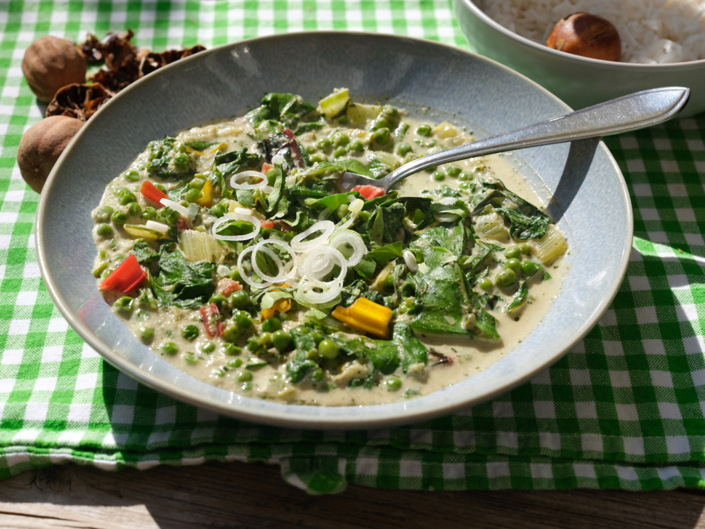 Doe de koriander, knoflook, sjalotjes, groene peper, gember, komijnpoeder en zonnebloemolie in een hoge kom en pureer het met de staafmixer tot een groen goedje. Maak met een klein scherp mesje inkepingen aan de zijkant van de limoenen. Kook de basmatirijst volgens de aanwijzingen op het pak samen met de limoenen. Duw die af en toe onder water zodat ze zachter worden. Snijd de stelen van de snijbiet klein en de bladen grof, hou ze apart van elkaar. Giet de rijst af, haal de limoenen eruit (niet weggooien!), doe de rijst terug in de pan en laat afgedekt staan. Bak de groene currypasta met de snijbietsteeltjes in een wok of diepe koekenpan 3 minuten op laag vuur. Doe de kokosmelk en de limoenen erbij. Laat 5 minuten pruttelen en duw weer af en toe op de limoenen voor extra smaak. Voeg de doperwten toe en laat 2 minuten pruttelen. Voeg de bladeren van de snijbiet toe en warm kort door tot de snijbiet is geslonken. Breng op smaak met vissaus. Serveer de curry met de rijst en bosuiringetjes.