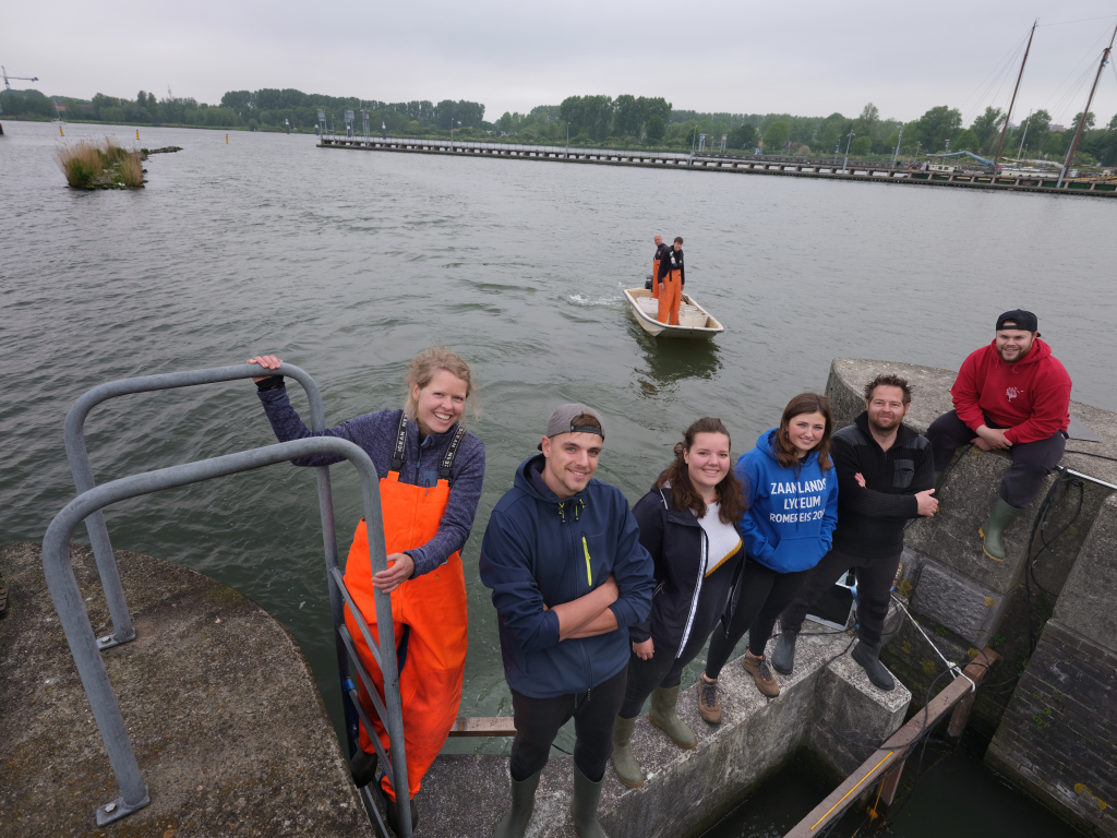 Foto, van links naar rechts: Ingeborg Mulder (Marien Ecoloog van Wageningen Marine Research), Bryan Korbeeck (stagiair UvA), Laura Lemey (stagiair WMR), Ymke Winkel (stagiair UvA), Rob Kroes (UvA), Aron Coffa (student UvA). Op de achtergrond achter de motor Bram van Wijk van Visserij Service Nederland en Koen van Linschoten. Eén vis is de groep opgevallen, die gaat de hele dag heen en weer door de passage. Ze hebben hem de bijnaam Gekke Henkie gegeven.