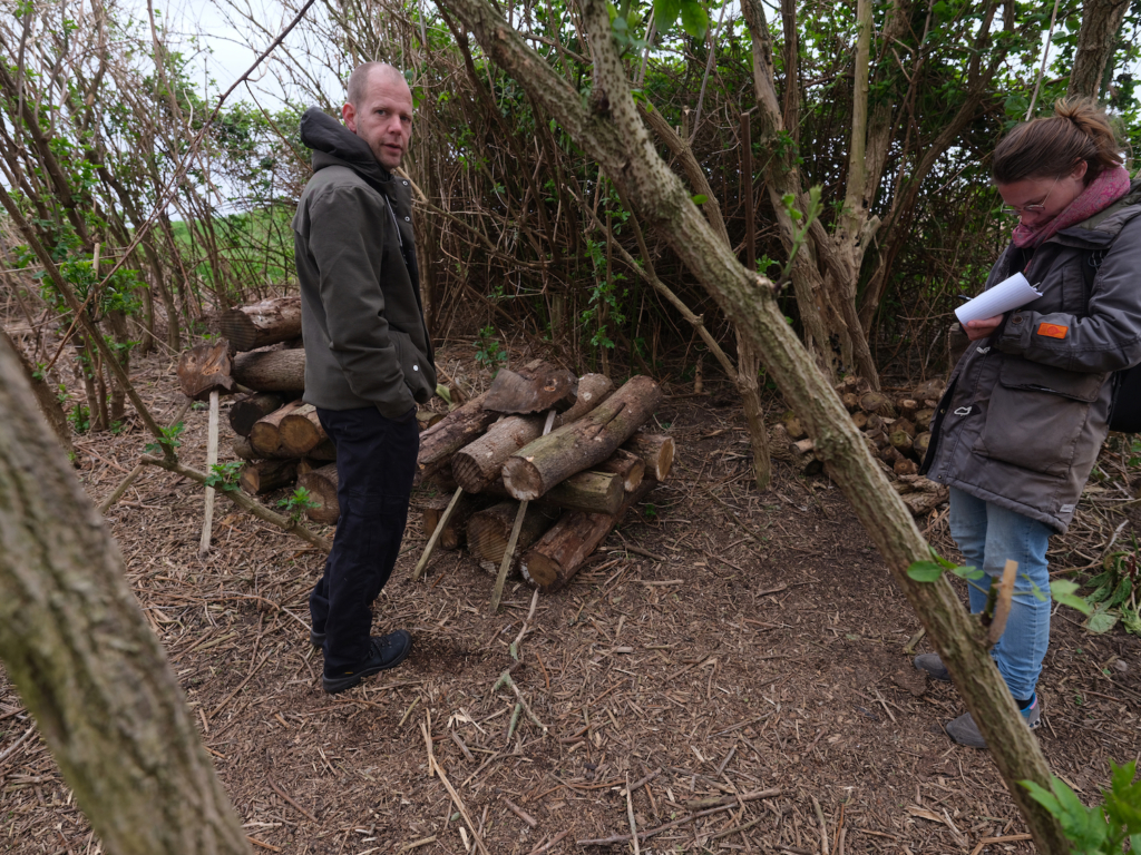 Iets verderop loopt hij een klein vlierbosje in, waar een paddenstoelenkwekerij is gestart. Opgestapelde stammen van zomereiken en vlierbomen zijn geënt met het mycelium van shiitake, oesterzwam en populierenleemhoed. “Het duurt anderhalf jaar voordat het verrottingsproces van een boom start,” weet Jurre. Hij voelt aan de witte oesterzwammen die uit de boomstammen stulpen. “Hier zie je het al gebeuren.”