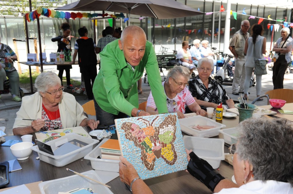 Ivar Manuel, voorzitter van de bestuurscommissie van stadsdeel Oost, is er speciaal voor langsgekomen. Het Kramatplantsoen is omgetoverd tot een aangenaam en zomers plein met bankjes en bloemenvelden, beschut door enkele oude beuken die zorgen voor sfeer en schaduw. Midden op het plein staat een meterslange tafel, waar oud en jong werken aan vrolijke mozaïeken van vogels, bloemen en portretten.