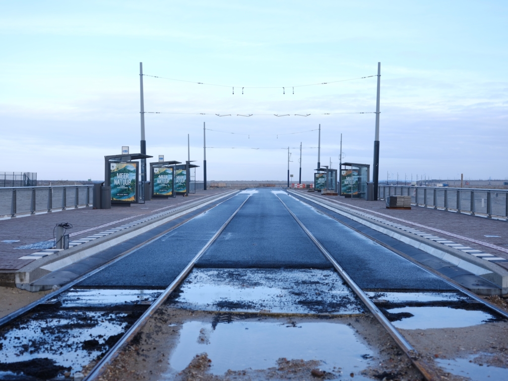 De tramlijn naar nergens – was ik filmmaker dan had ik me gehaast, alles staat klaar voor een moderne western in de frontier van de stad. Hier is nog bijna niets, alleen een zee van zand. Het is verboden gebied, maar als je er toch komt zie je niet alleen de tramsporen liggen die ooit een nieuwe wijk zullen bedienen, maar ook de hoogspanningsmasten, de perrons en de abri’s. Er staan zelfs vuilnisbakken.