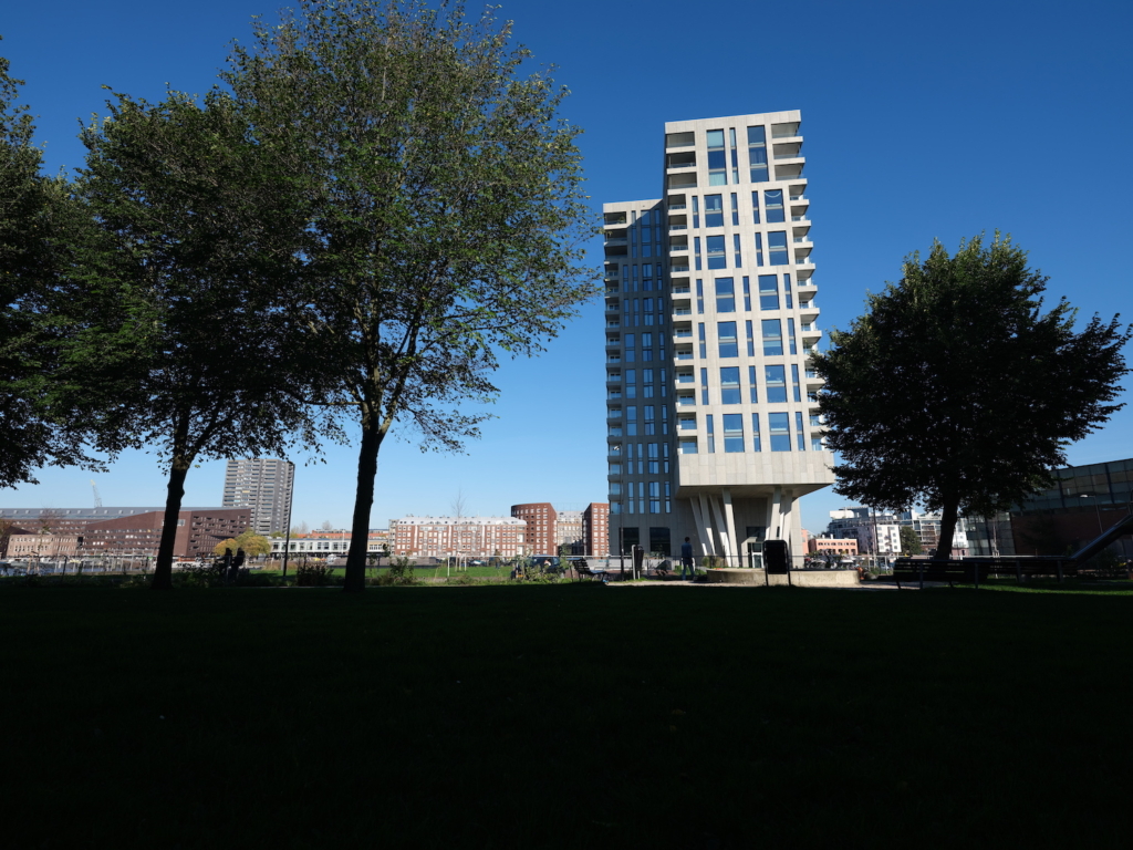 In de jaren dat ik op Borneo-eiland woonde, was het nog een hobbelig voetbalveldje. Daar aan de Ertshaven moest het architectonisch sluitstuk én klapstuk van de buurt komen. Maar omwonenden plakten posters op de ramen met Stop Fountainhead! Een boosaardig wolkenkrabbertje met graaihandjes, een krachtig beeld. Voor het eerst zag ik hoe buurtbewoners een voor hen ongewenste stedelijke ontwikkeling in een kapitalistisch frame plaatsten. De vooraanstaande architecten en juristen die er woonden voerden een effectieve strijd. Met vertragingstactieken en een handje geholpen door opeenvolgende crises in de wooneconomie, kon er na jarenlange juridische strijd een streep door Fountainhead. Bewoners mochten toen zelf een ontwerp kiezen. De tegenover de kavel wonende architect ontwierp een rank gebouw waaruit het publieke buurtbordes plus 2/3 van het woonvolume verdwenen.