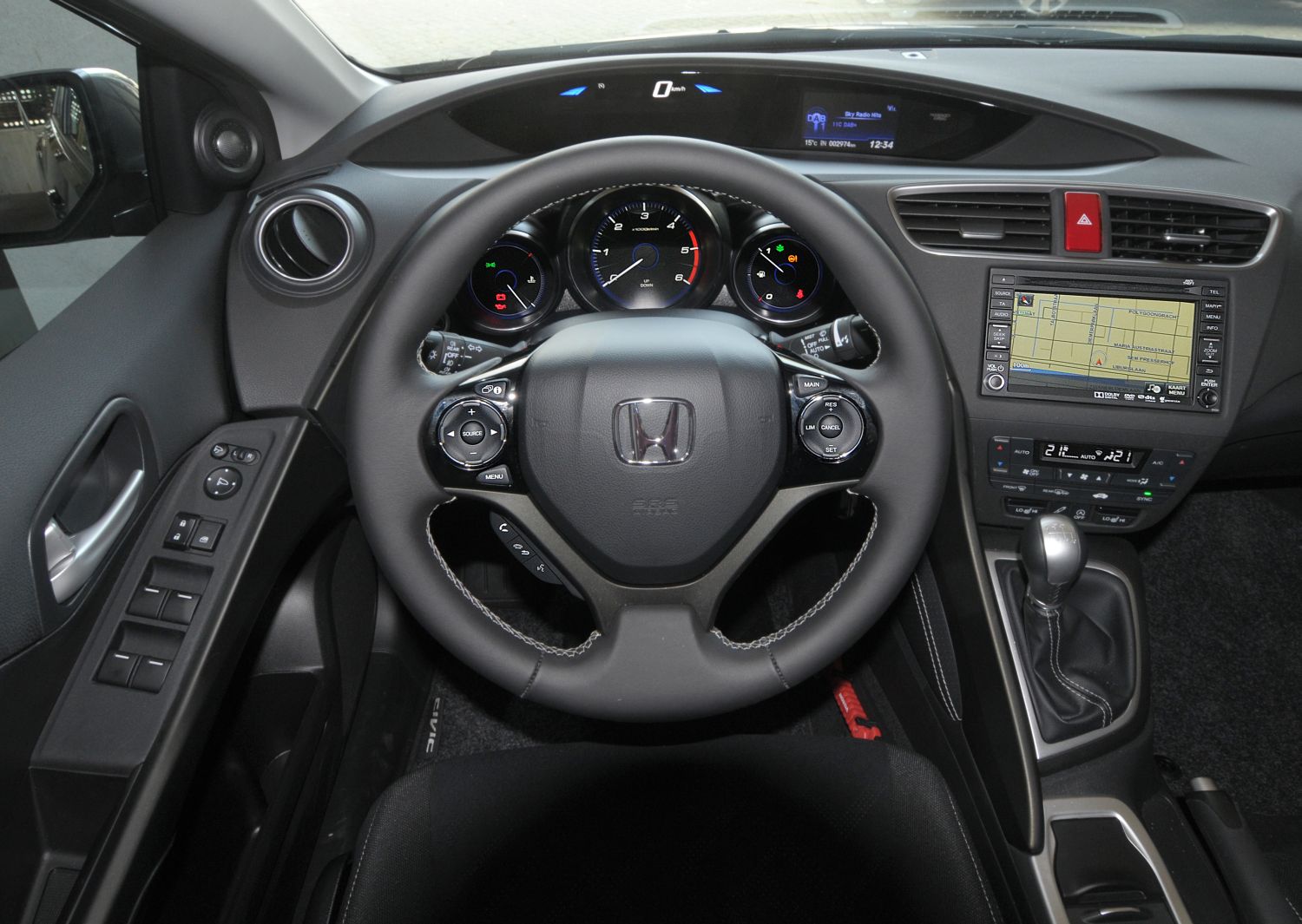 Het eerste dat opvalt in de cockpit van de Civic Tourer is de uitgekiende ergonomie van het dashboard, je vindt vrijwel intuïtief alle knopjes en bedieningsorganen aan en op het stuur en de middenconsole zonder dat je daarvoor eerst het boekje uit je hoofd moet hebben geleerd. Geen grote groepen knoppen en schakelaars bij elkaar, maar logisch bij elkaar horende groepjes die er voor het oog zeer rustig en geordend uitzien. Verder is het dashboard van links naar rechts, inclusief de middenconsole, in een lichte boog om de bestuurder heen gevormd waardoor je vanuit de rijderspositie zonder enige moeite overal bij kan en het geheel prettig te overzien is.