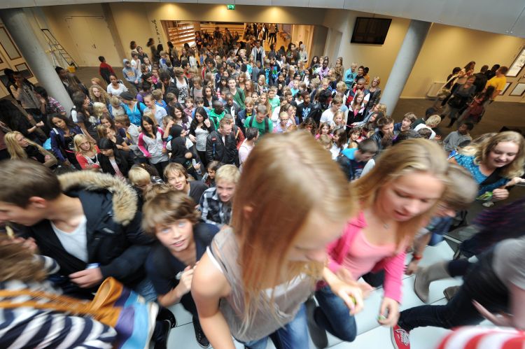 Foto: De allereerste schooldag in het nieuwe gebouw, in september 2011. Alle vijfhonderd leerlingen gaan tegelijk naar binnen.