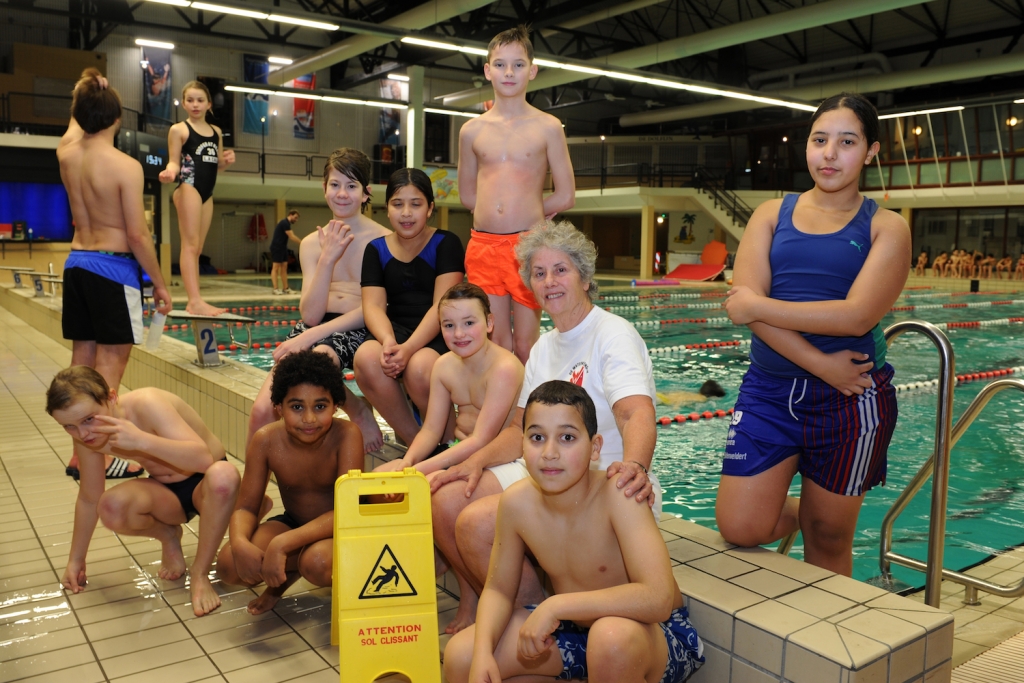 Dinsdagavond, halfacht. In het Sportfondsenbad Oost komen de kinderen even uit het water om met juf Betty (68) op de foto te gaan. Ze zijn nog geen tien, maar zwemmen kunnen ze als de beste: de groep gaat binnenkort op voor het diploma Zwemvaardigheid 2. Ze hebben al heel wat diploma’s op zak, maar vinden het zwemmen zo leuk dat ze steeds weer naar een volgend doel willen toewerken.