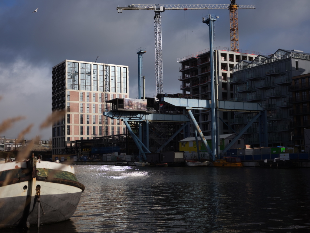 Eerst maar eens over het mooie gedeelte: wat gaaf, zo’n robuust betonnen grid, in combinatie met die fijnmazige zwarte kozijnen, waarvan de ruitjes de wolkenluchten en het water weerspiegelen. Wat een rake verwijzing naar het industriële verleden van dit gebied! Een gebied waar ooit de 19de-eeuwse fabriekshallen van Stork en Werkspoor stonden, met die kenmerkende kleine ruitjes.
