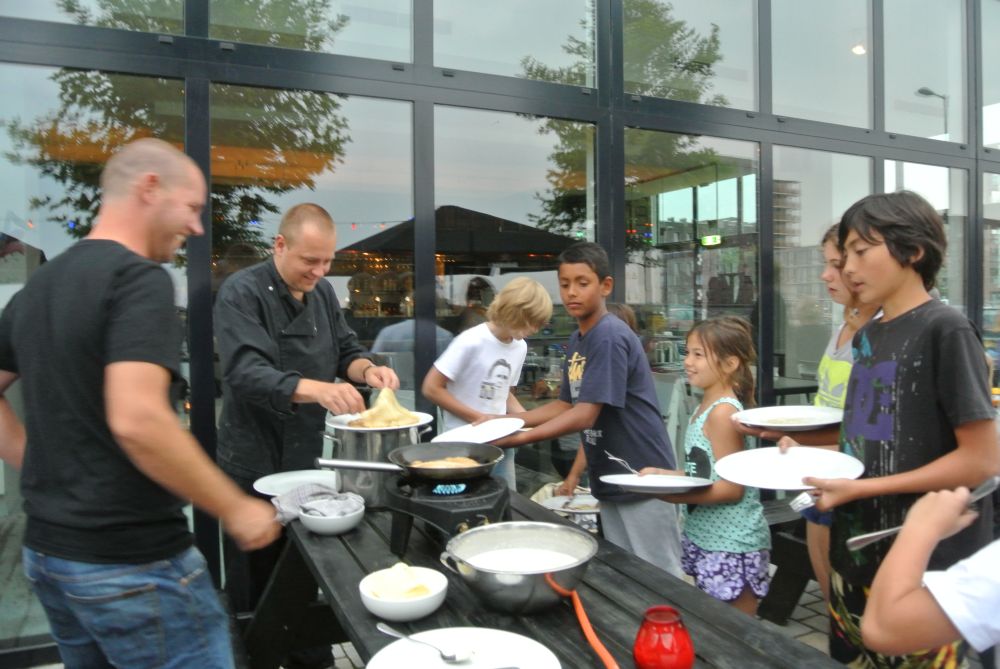 Op het terras van NAP staat de koekenpan klaar, en de brander. De kok en Dylan van het restaurant aan de haven bakken er stapels, voor vijftien uitgehongerde kampeerkinderen. Er komt ook nog biologisch ijs, van MLTD. Kardemom, pompoen, gekke smaken. Lekker ook. Het is het slotstuk van drie bloedgave dagen kamperen op IJburg. Het is mooi geweest. Of nou, nog één allerlaatste keer zwemmen dan….