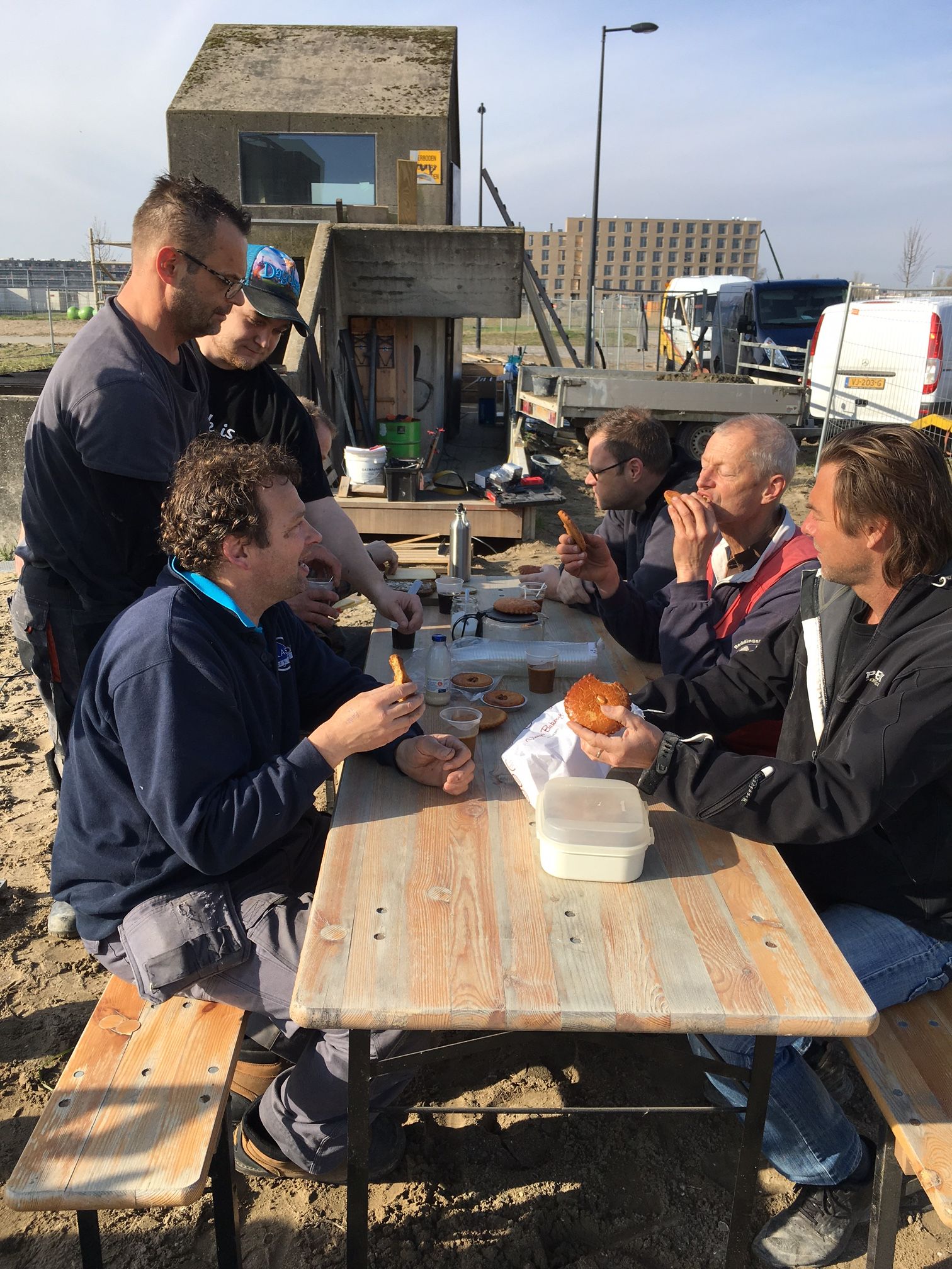 Totaal ontspannen en hersteld van alle zware arbeid fiets ik de volgende ochtend opnieuw naar de bouwplaats. Bij aankomst staat de man alweer met wijd opengesperde neusgaten bij het hek. ‘Het gaat hier helemaal mis,’ snatert hij. Ik kijk, maar kan zo snel geen ongeluksplek ontdekken. Uit de zuidsleuf komt een katrol omhoog, een bouwman met billenspleet grijpt de eraan bungelende lege haak.