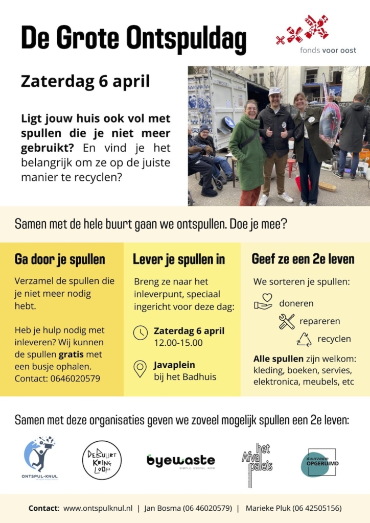 Op 6 april, de Grote Ontspuldag, kan iedereen gratis zijn overbodige spullen inleveren op het Javaplein. Ligt je huis vol spullen die je niet meer gebruikt? Organisator Ontspulknul geeft die dan een tweede leven: ze worden gedoneerd, naar de kringloop gebracht of op de juiste manier gerecycled. Het is eigenlijk heel simpel: ga door je spullen, verzamel wat je niet meer nodig hebt, en breng ze naar het speciaal ingerichte inleverpunt bij het Badhuis op het Javaplein, tussen 12.00 en 15.00 uur. Voor meer informatie zie ontspulknul.nl.