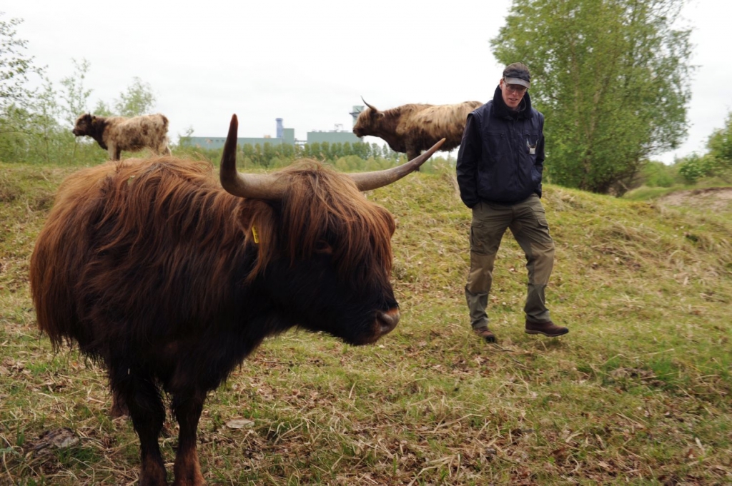 Arjen Boerman van FREE Nature klimt bij de Baai van Ballast over een gloednieuw houten hek. Sinds een maand lopen erachter vier Schotse Hooglanders. “Dit was een verruigd gebied toen we het in maart 2017 in beheer kregen van NUON”, vertelt Boerman als we over een pad verder lopen. “Je ziet het effect van de grote grazers direct: het landschap is open met hier en daar wat bramenstruweel en meidoorn.”