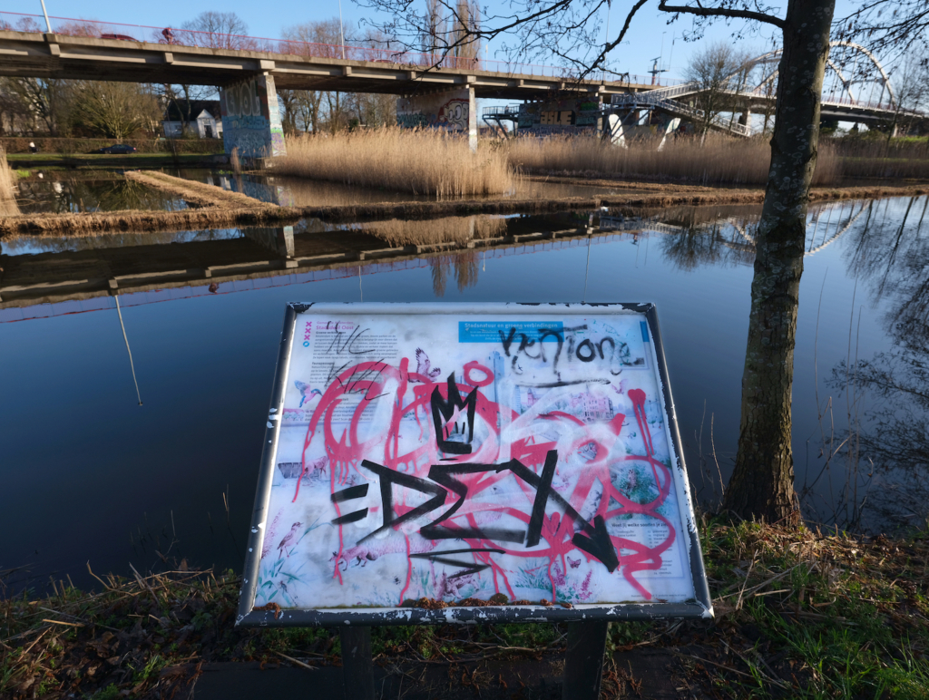 Het is vast niet de reden geweest dit bord te bekladden, redenen voor vandalisme zijn meestal verveling of ‘ik weet het niet, edelachtbare’, maar in dit tijdsgewricht moet alles uitgelegd. Er is geen wandelpad meer te vinden zonder vermanende of verklarende bebording. Ik heb ze een tijdje verzameld, mijn lievelings staat naast een smalle zandweg en beschrijft hoe je dient om te gaan met tegemoetkomend wandelverkeer: ‘respect: doe rustig aan, waarschuw elkaar, ga aan de kant, groet elkaar’. Je zou er agressief van worden.
