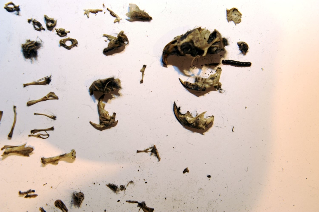 Edo Goverse strooit een plastic zak vol donkergrijze, pluizige ballen uit op een wit vel papier dat voor hem ligt. Hij pakt een bal tussen duim en wijsvinger en begint er met een pincet aan te plukken. Al snel stuit hij op een piepkleine onderkaak van een muis. Met een tandenborstel poetst hij de haartjes eraf en bekijkt hem met een loep. “Een dwergmuis”, zegt hij stellig. “Dat zie je aan de knobbelkiezen en het formaat.” Het kaakje legt hij op de hoek van het witte A3-vel.
