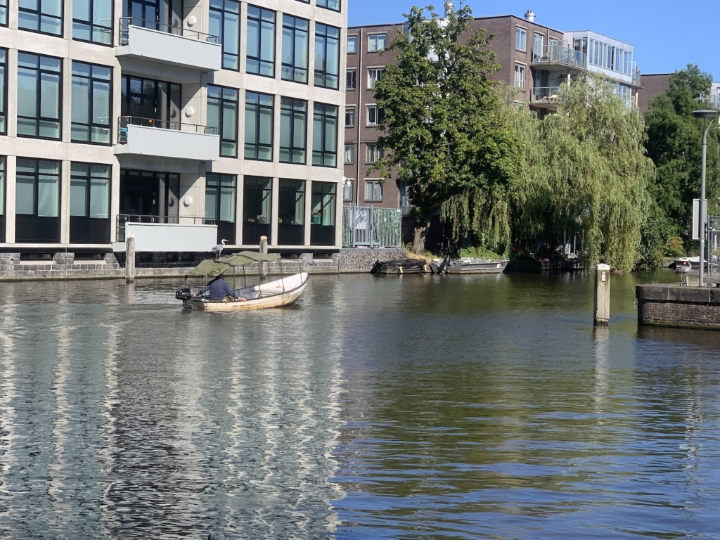 Terwijl de een geen genoeg van de zon kon krijgen, zochten anderen de schaduw op. Ondanks de drukte hadden de parken in Oost voor beide groepen genoeg plek. Tijdens het schooljaar wordt het UVA-terrein op het Roeterseiland voornamelijk bezocht door studenten, tijdens de vakantie zijn de bankjes en gazons een geschikte plek voor wie koelte en rust zoekt. Op het aangrenzende water, de Plantage Muidergracht en de Onbekendegracht, was het een komen en gaan van boten in allerlei creaties. Een reiger reisde mee op de daktent van een van de vaartuigen. Cockerspaniël Jules (8) verfriste zich in het grachtenwater en trok op zijn tijd een baantje.
