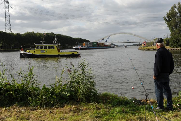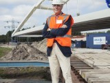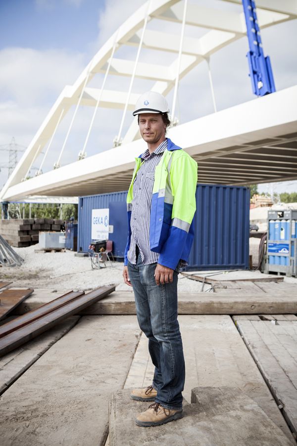 Er is dan wel even blijdschap op de kade. Maar klaar is het nog niet. De komende maanden worden de enorme aanbruggen naar het terrein getransporteerd. Daarna wordt nog eens 30 centimeter betondek op de brug gestort. Het bekistingssysteem – de ‘vloer’ waarin het loeizware beton wordt gegoten – is van met glasvezel versterkte kunststof. En dat is nog nooit eerder ergens op deze manier toegepast. “Alles is doorgerekend, alles klopt. Maar we juichen pas in 2013, als de brug echt af is.”