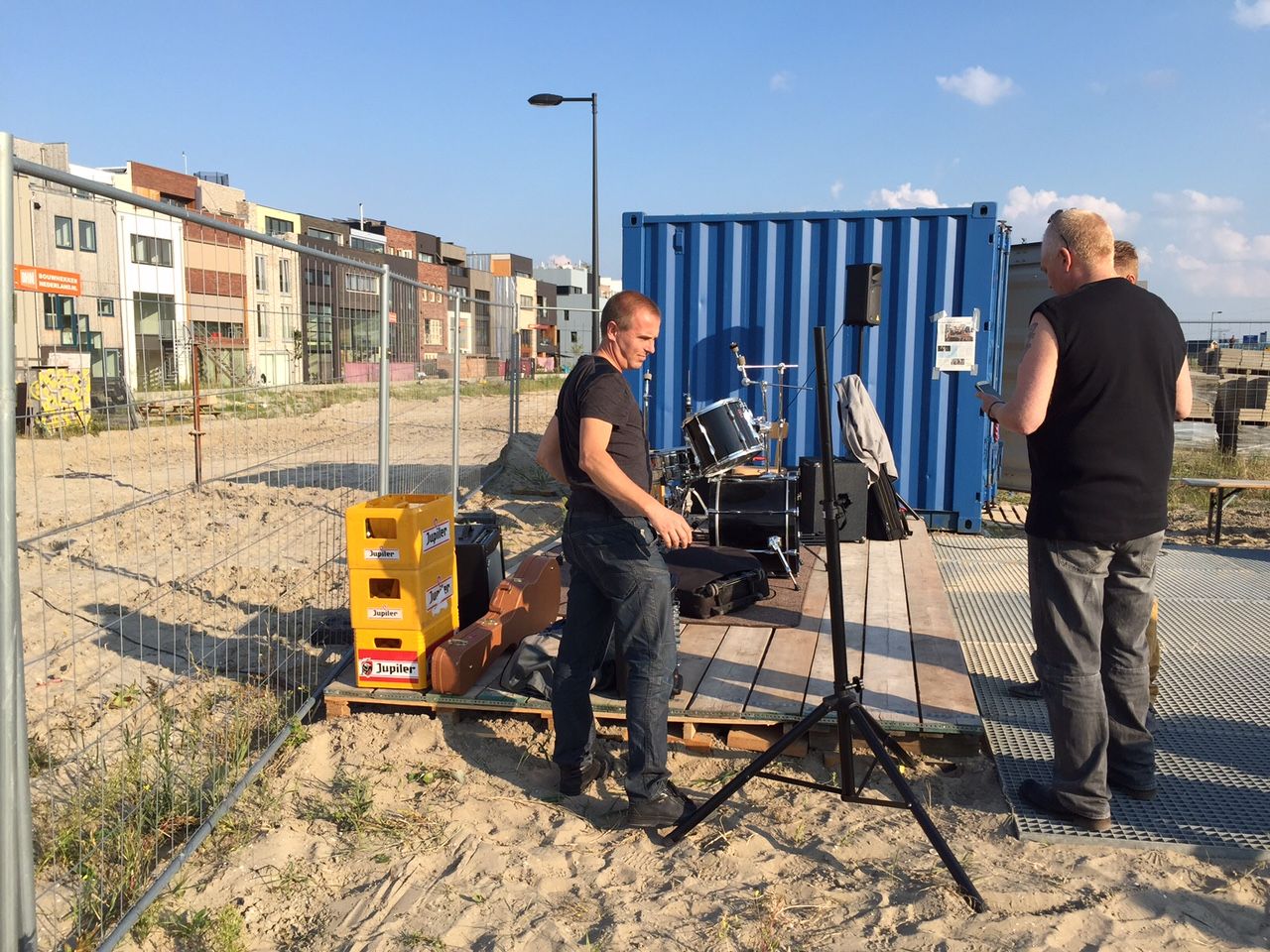 De band was nog aan het opbouwen. De instrumenten gingen van de auto over het zand naar het provisorisch door de Man gebouwde podium. De muziek kon versterkt, maar het mocht ook akoestisch. Dat zouden we van het volume laten afhangen. Er was geen plan voor overlast. Om 21.00 uur zou het klaar zijn, dan gingen we naar buurfestival Magneet.
