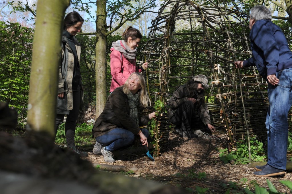 In de ‘Fairy Orchard’ prijkt een oude Japanse kers. De bloeiende roze bloemblaadjes laten een diffuus zonlicht door. Het is een geliefde plek voor trouwfoto’s, vertelt vrijwilliger Bob, die vandaag het onkruid achter in de tuin te lijf gaat. Vrijwilliger Wilco legt de laatste hand aan de zelfgevlochten wigwam. Bobby gaat werken aan het ‘blote voeten pad’, waar kinderen (en volwassenen!) over zand, houtsnippers, dennenappels en kamilleplantjes kunnen lopen.