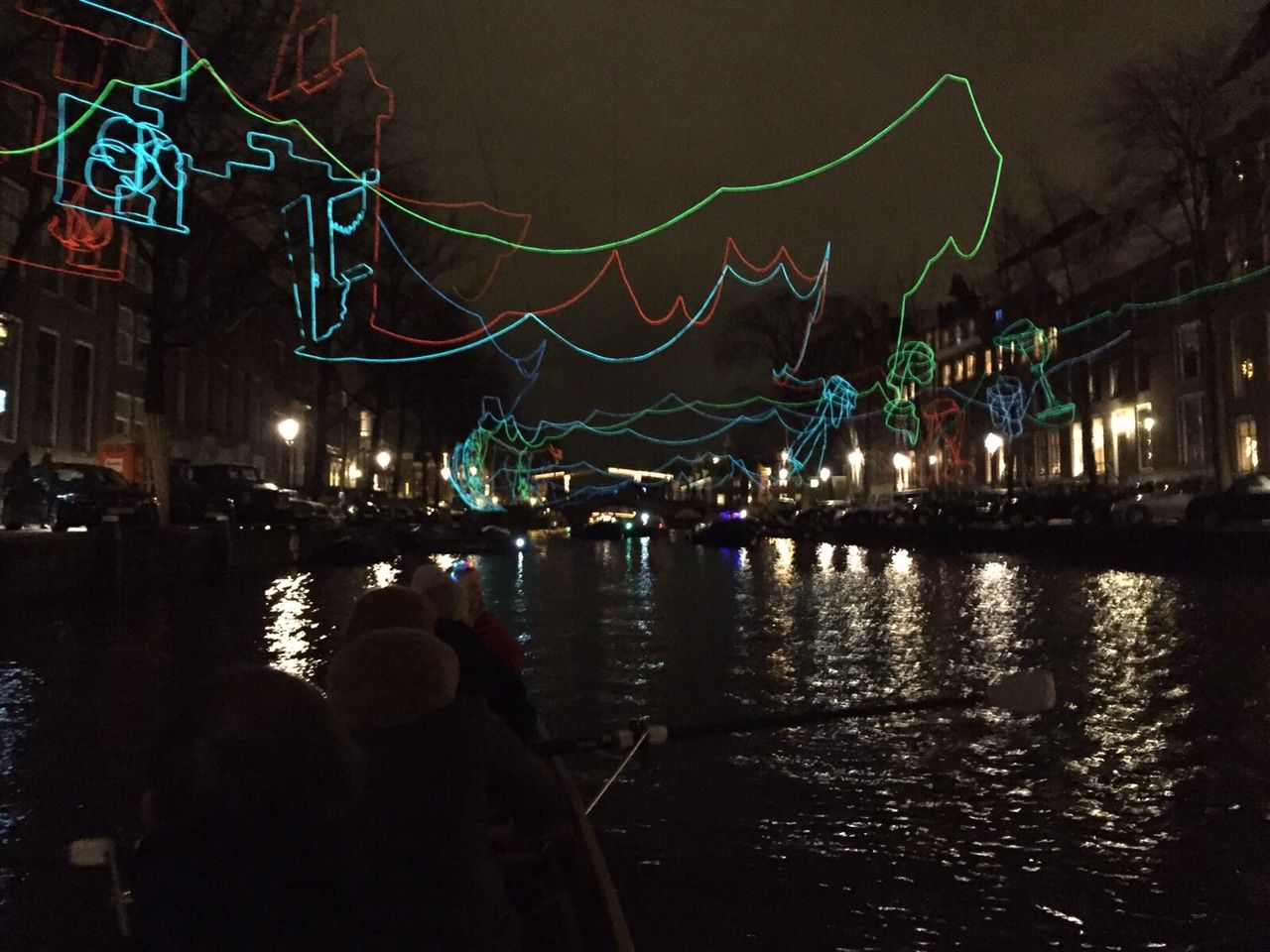 Het festival is prachtig vanaf het water, de buitenlucht heerlijk (koud hebben we het geen moment gehad) en het roeien opwindend (altijd beducht zijn op die snoek…). Roeien langs Amsterdam Light Festival, we kunnen het iedereen aanraden.