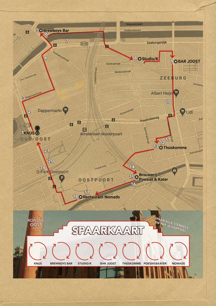 Wie doen er mee aan het Rondje Oost? Bar-bistro Knus, Brewboys Bar, Studio/K, Bar Joost, Thúskomme, Poesiat & Kater en Nomads. De nieuwste updates vind je op Instagram (@rondjeoost) en FB (rondjeoost).