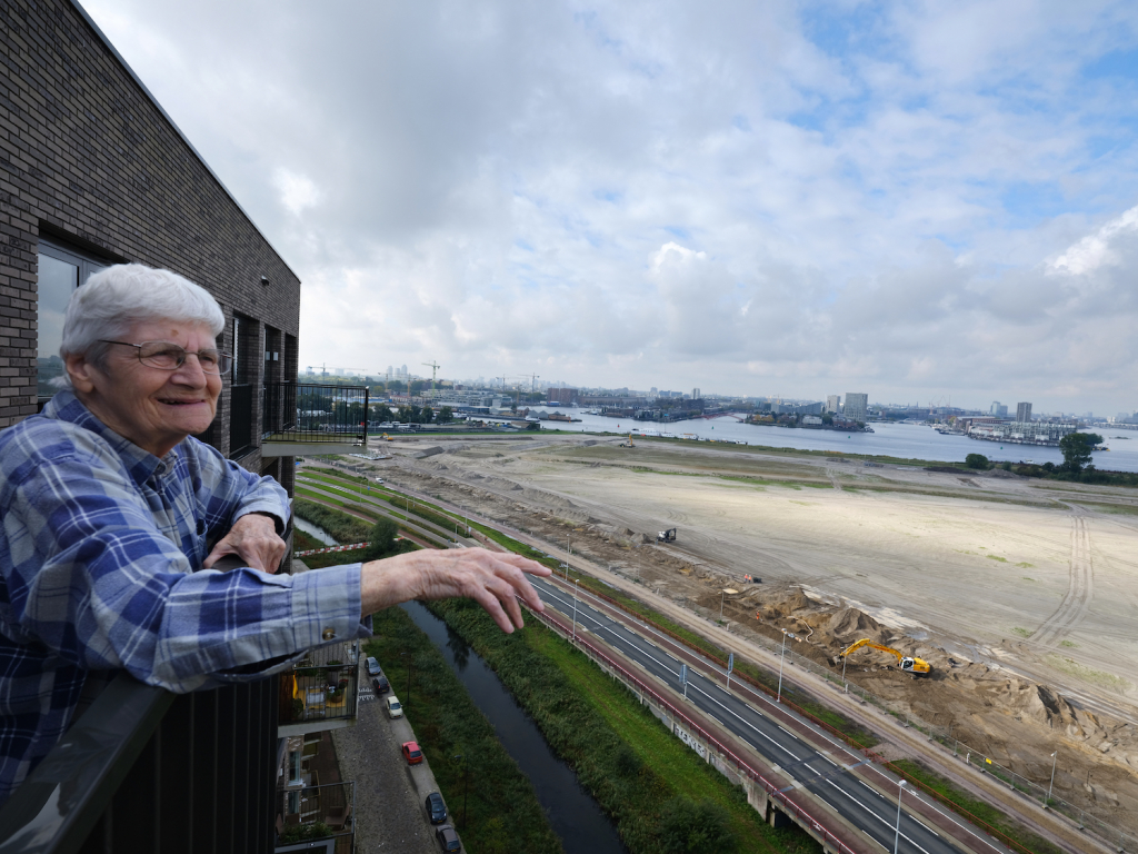 Foto: Saar Boerlage wijst vanaf haar balkon richting de nog kale Sluisbuurt. Ze voert actie tegen de geplande hoogbouw. Maar veel Amsterdammers kijken ook uit naar de komst van de torens in de Sluisbuurt. Architect Jan van Erven Dorens betoogde vorige maand in deze krant: “De torens worden onderdeel van een fantastische skyline langs het IJ, die zich van mij mag uitstrekken van IJburg tot Zaandam. Vernieuwing is nu juist hetgene waar de tegenstanders bang voor zijn.”