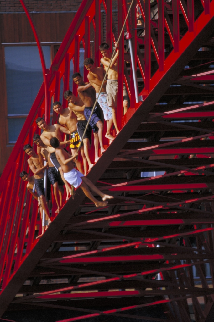 Geruime tijd geleden kwam mij een foto onder ogen van Jeroen Musch. Het was een aankondiging voor een foto-estafette in het Borneo Architectuur Centrum (BAC). Een groepje jongens in zwembroek hangt aan een rode brug. Een jongen zwaait aan een touw naar beneden en zijn vrienden kijken hem bewonderend na. Ze hebben een glimlach op hun gezicht, maar de middelste jongen kijkt een beetje bezorgd. Zou het zijn broertje zijn?