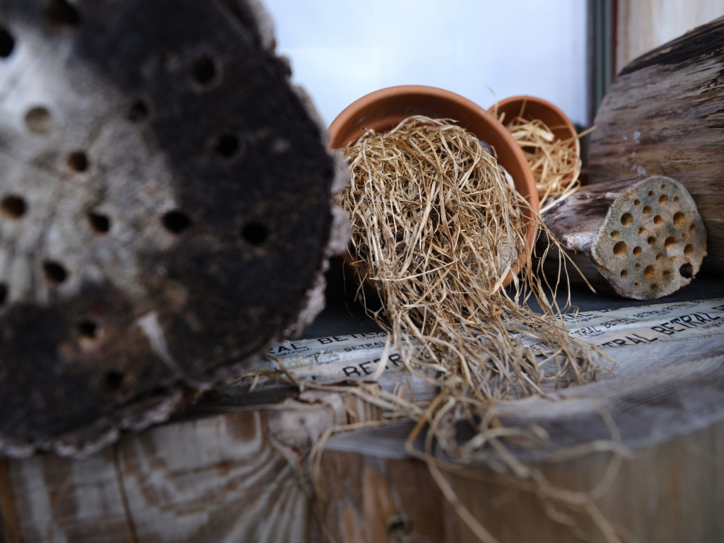 Wilde bijen en andere bestuivers help je door gaatjes te boren in een houtblok. Je kunt ook een stevige, afgewaaide boomtak in stukken van 20 centimeter zagen. Zolang je hard en onbehandeld hout gebruikt, is het goed. Door steeds een ander boortje te kiezen maak je gaatjes met een diameter van 2–10 millimeter. Maak de gangen 3 tot 20 centimeter diep en zorg ervoor dat de achterkant dicht blijft. Schuur de opening mooi glad, dan beschadigen de insecten hun vleugels niet. Hang het houtblok op een beschutte, droge plek (op het zuiden), minimaal een meter boven de grond.