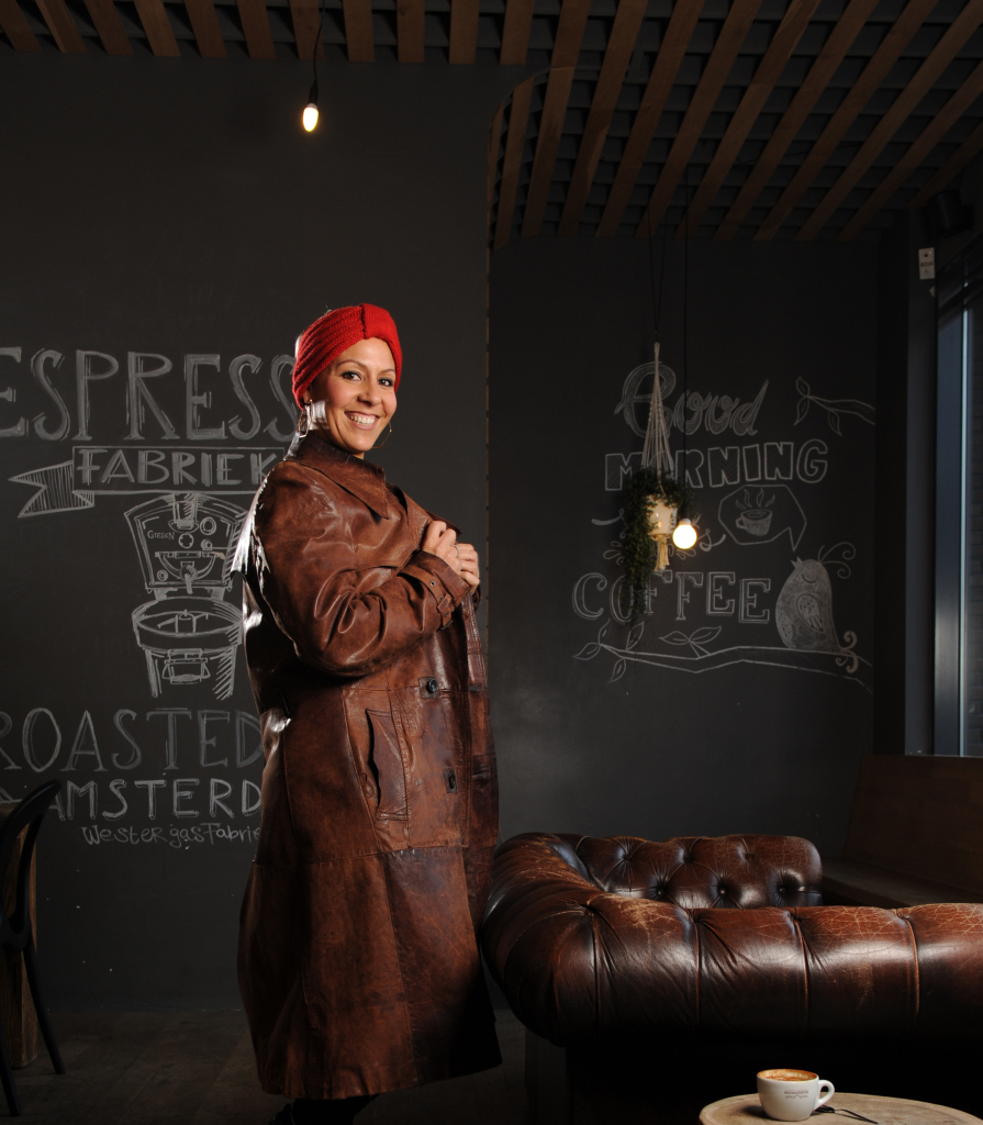 “Bijna elke ochtend, nadat ik de kinderen naar school heb gebracht, ga ik hier bij de Espressofabriek koffiedrinken. Kan ik een beetje wakker worden. Want daarna train ik bij Life and Kicking. Mijn lijf is m’n werk, ik moet fit blijven.” Ze bestelt een flat white. “Dit is de lekkerste koffie van IJburg.”