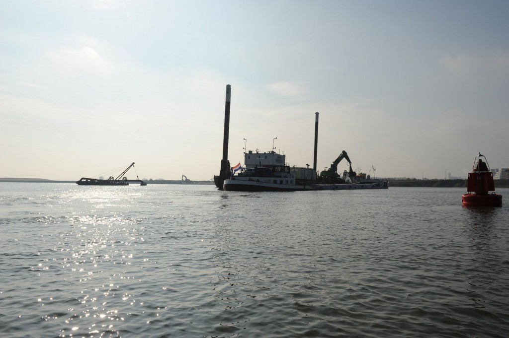 Aan de westkant van de landtong, te zien vanaf het surfstrandje aan de Bert Haanstrakade, werken Sjaak en zijn mannen aan oeverbescherming. Tegelijk zorgt een grondpers daar via leidingen over de landtong voor de aanvoer van zand voor een nieuw stuk schiereiland van ongeveer 500 bij 500 meter aan de oostkant. Zeshonderdduizend kuub zand wordt daar via de pannenkoekmethode laagje voor laagje opgespoten.