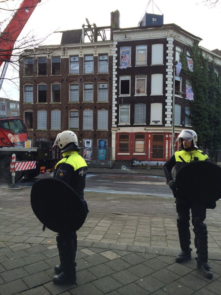 “We hadden hier op gerekend,” zegt Schaap. Enkele dagen daarvoor hadden agenten ‘met platte pet’ al geprobeerd de krakers uit de woning te krijgen, maar zij werden verjaagd. Daarop rukte de ME uit met jaren tachtig arsenaal: een waterkanon, meerdere busjes, een hijskraan en –omdat het al van tevoren duidelijk was dat het uren zou gaan duren – een toilet/kantinewagen.