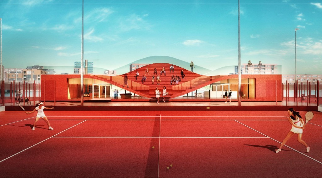 Het nieuwe clubhuis van Tennisclub IJburg is – letterlijk – bekend van hier tot Tokio. En dat terwijl de bouw nog moet beginnen. Met dank aan het revolutionaire ontwerp van het wereldberoemde Rotterdamse architectenbureau MVRDV. Het gravelrode gebouw op Rieteiland Oost is clubhuis, tribune en uitkijkpunt ineen.