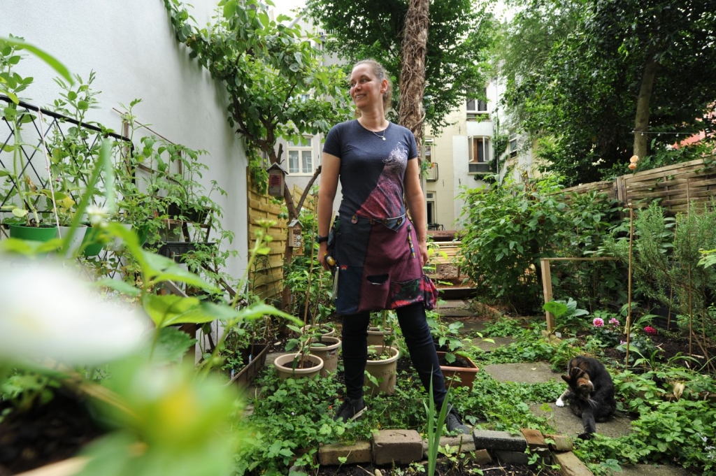 In haar tuintje aan de Transvaalstraat hangen en staan overal waar je kijkt potjes en bakjes met planten erin, vrijwel allemaal eetbaar. Iris Effendi besloot vanwege de beperkte ruimte in haar tuin de hoogte in te gaan. “Je hebt niet veel plaats nodig om toch een flinke oogst te hebben. Door verticaal te gaan, kan ik meer laten groeien.”